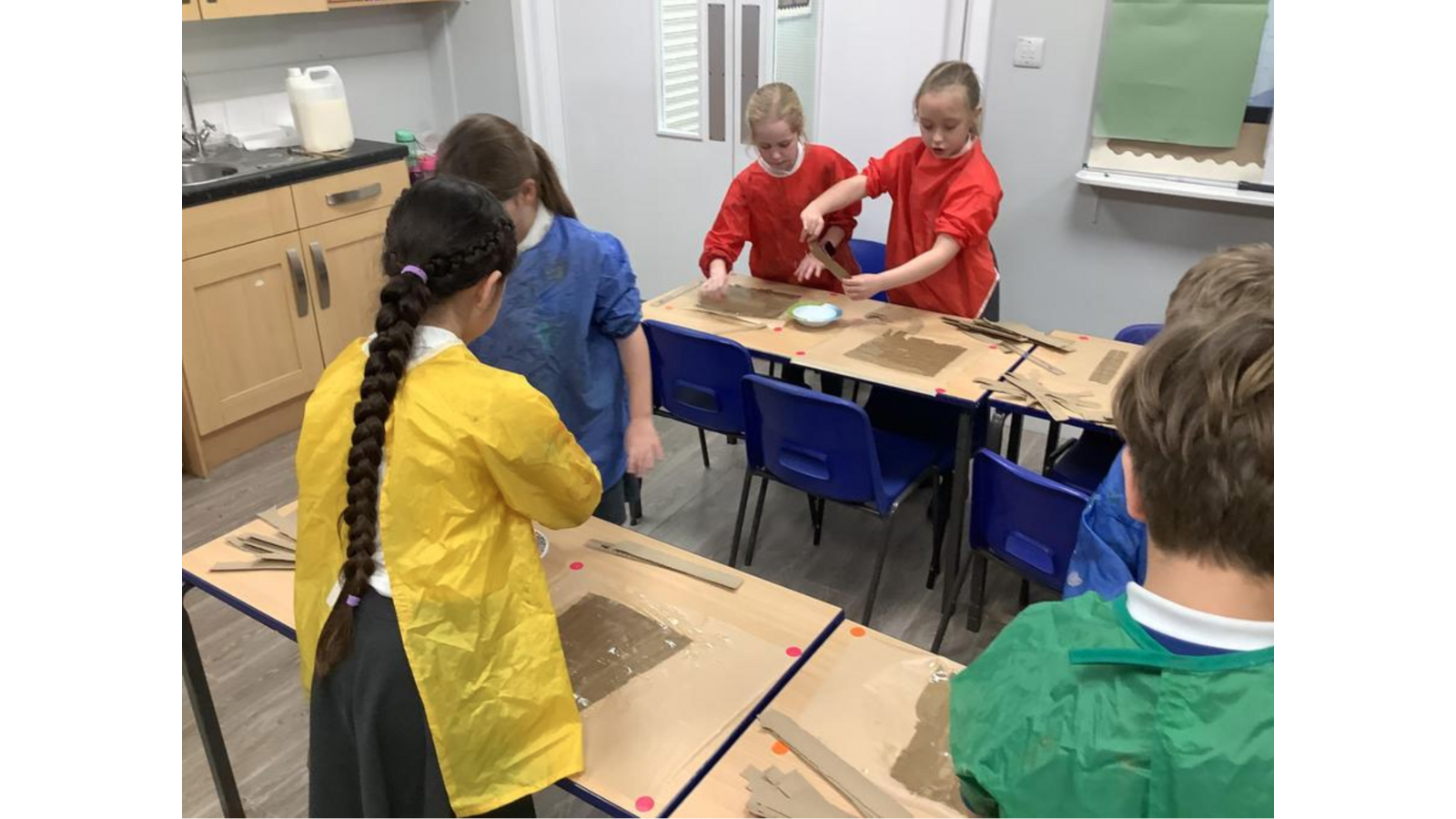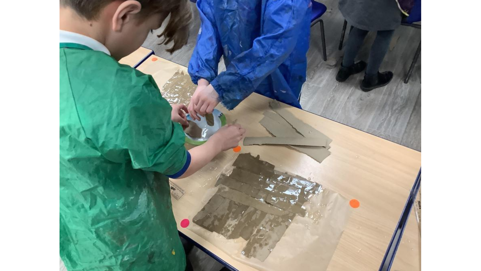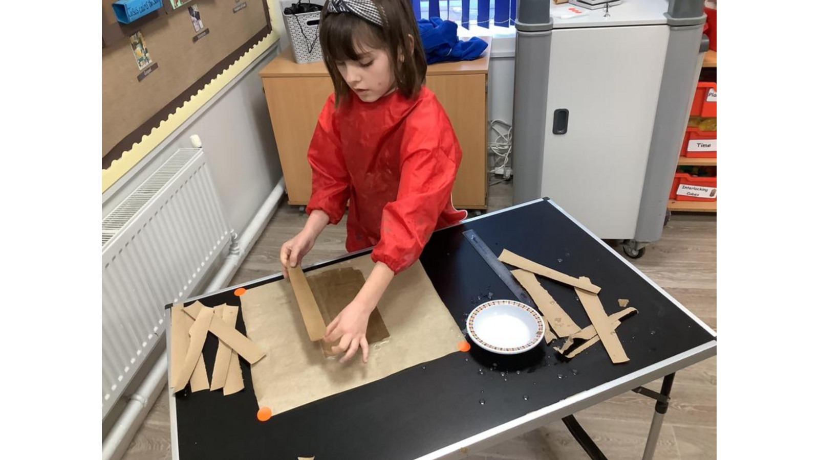 A very messy afternoon. We have used strips of parcel paper with glue to create papyrus like paper ready for our Egyptian art next week.