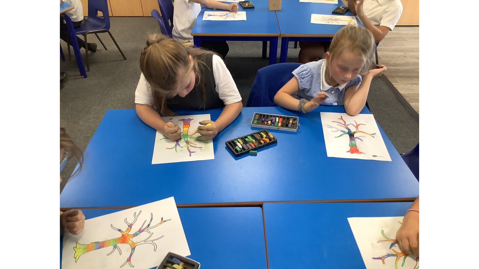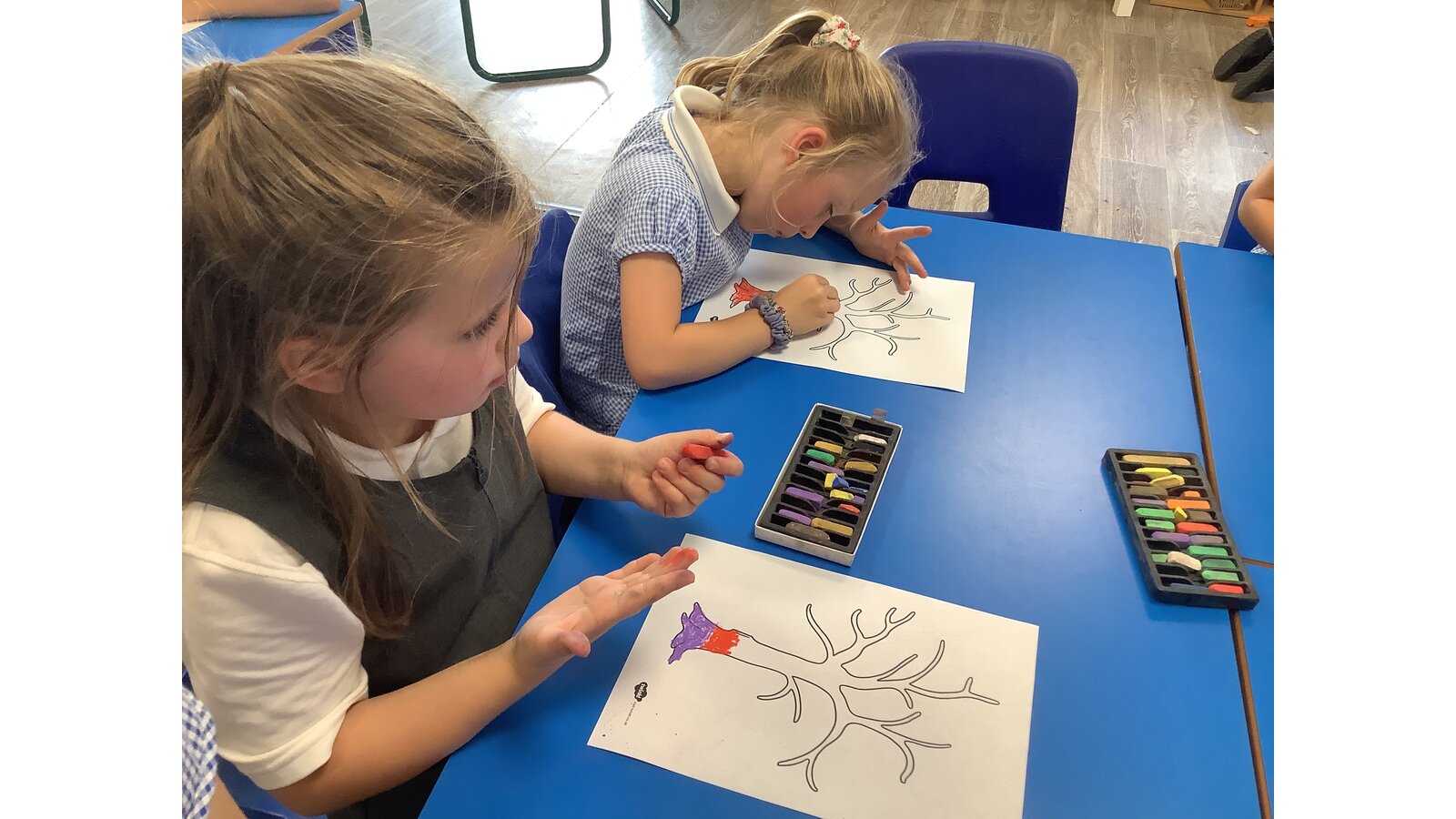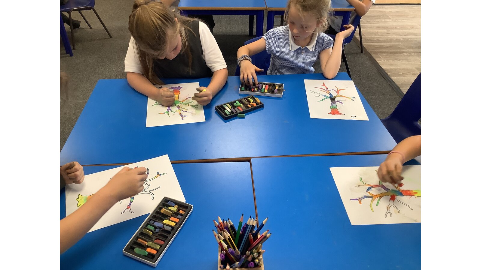 In our first week back we listened to the story In Our Hands and thought about the ways we can make a positive difference and grow and flourish in our new school year. We talked about our school values and how they can help us in our learning and teamwork. We created our own trees of hope using chalk pastels.