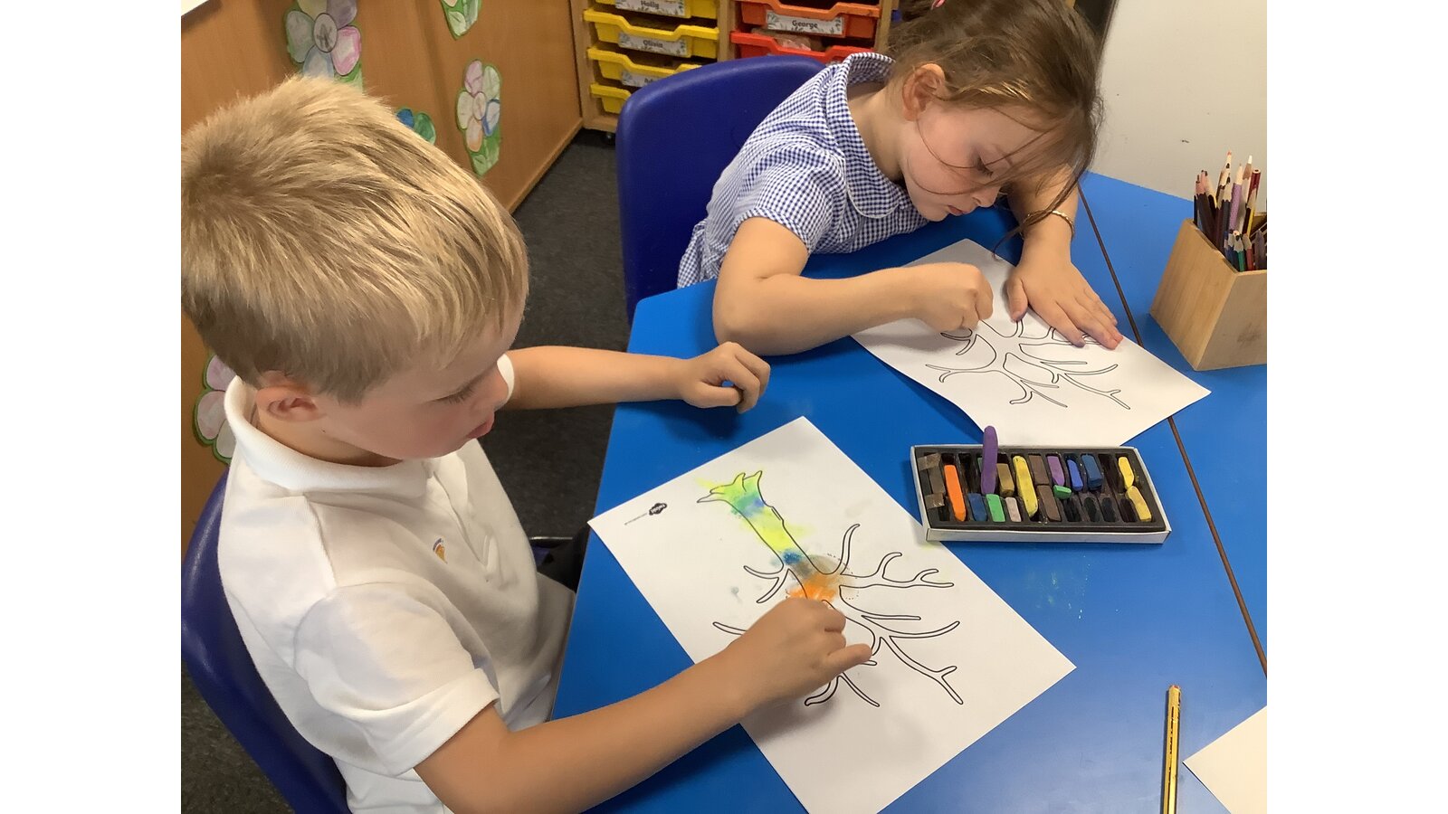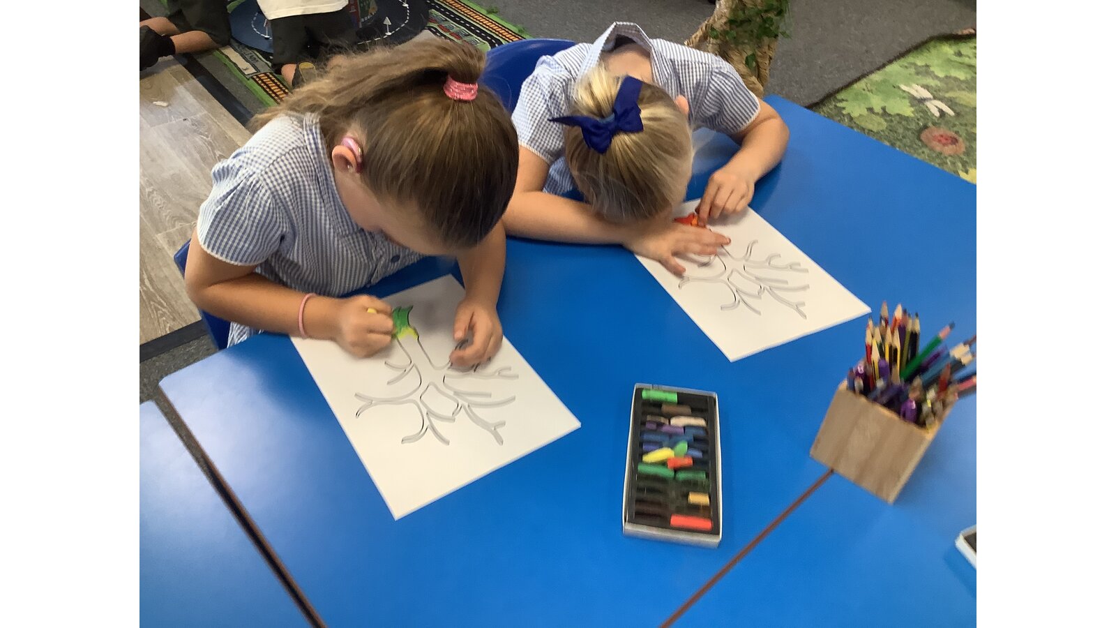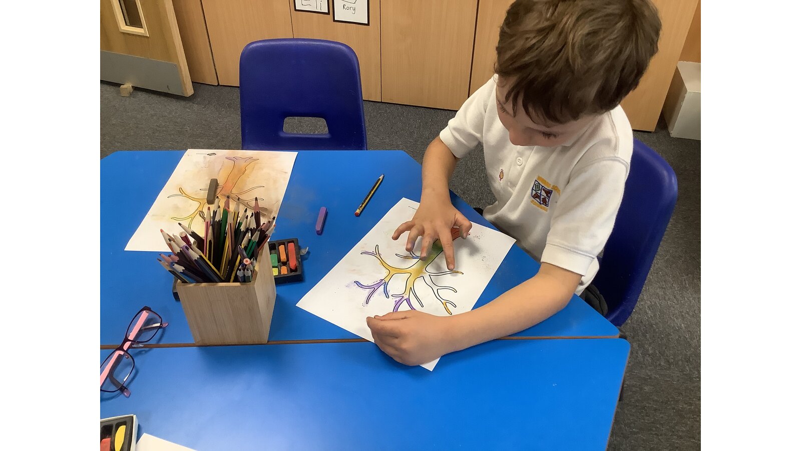 In our first week back we listened to the story In Our Hands and thought about the ways we can make a positive difference and grow and flourish in our new school year. We talked about our school values and how they can help us in our learning and teamwork. We created our own trees of hope using chalk pastels.