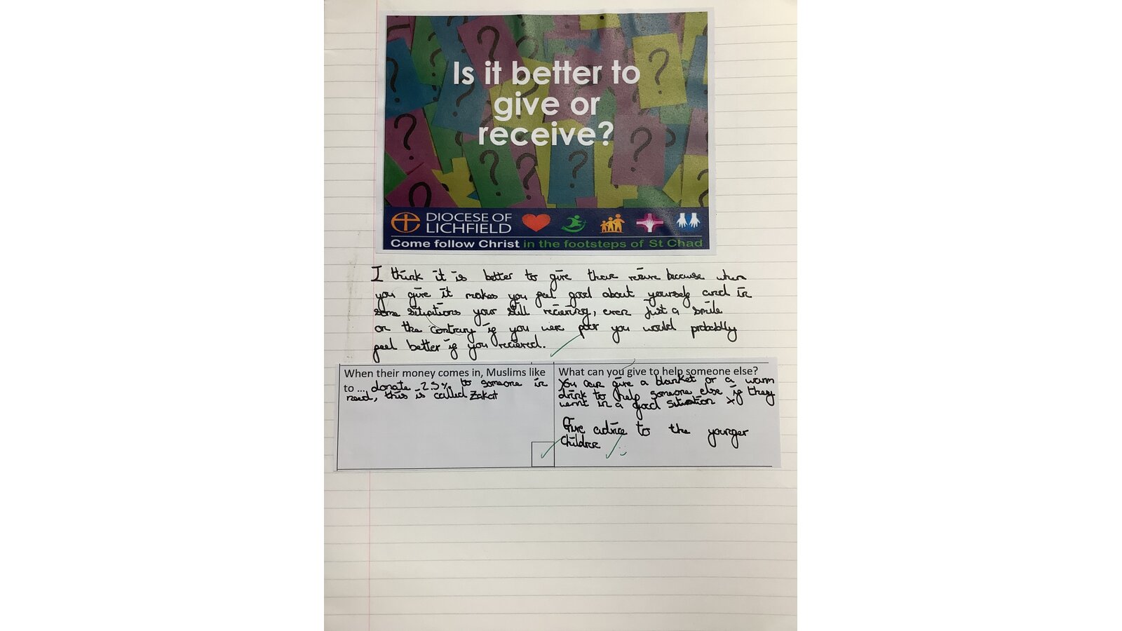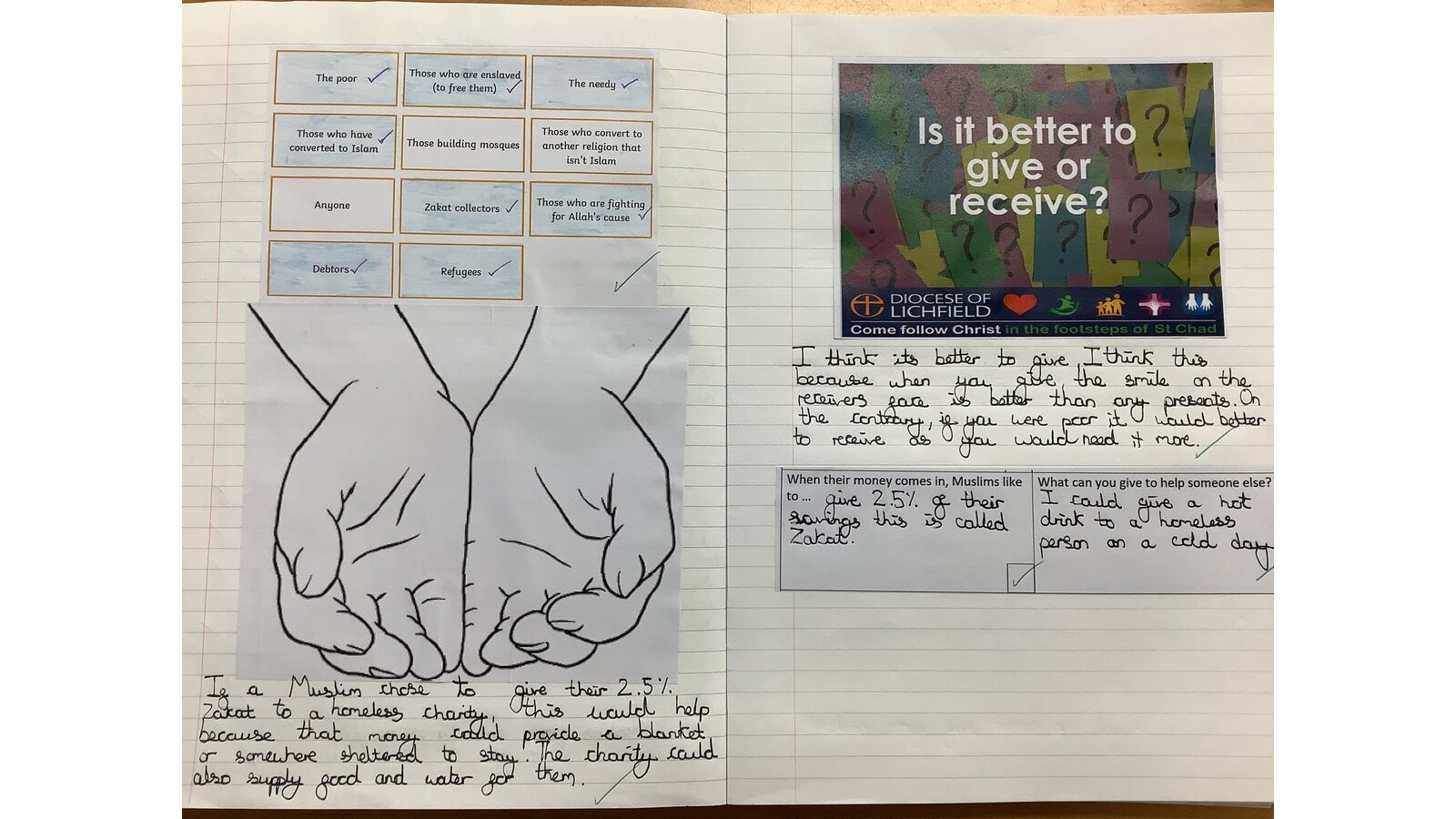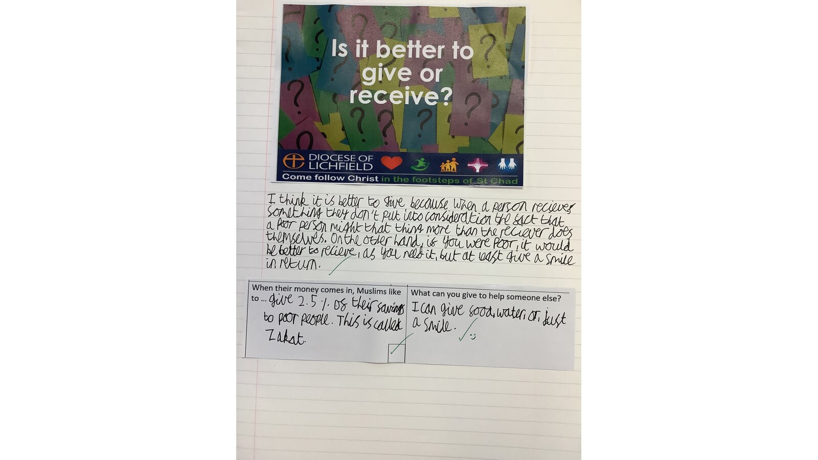 In RE this week, Class Three learned about the third pillar of Islam, Zakat. The children considered the importance of charity for Muslims and answered the big question, ‘Is it better to give or receive?’ after reflecting on their own experiences.