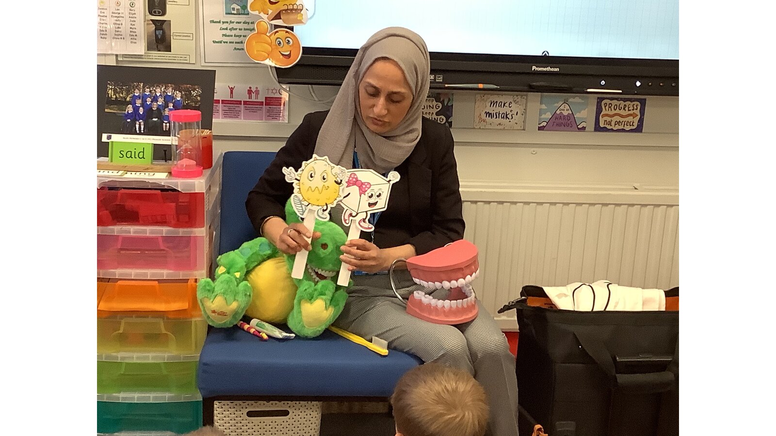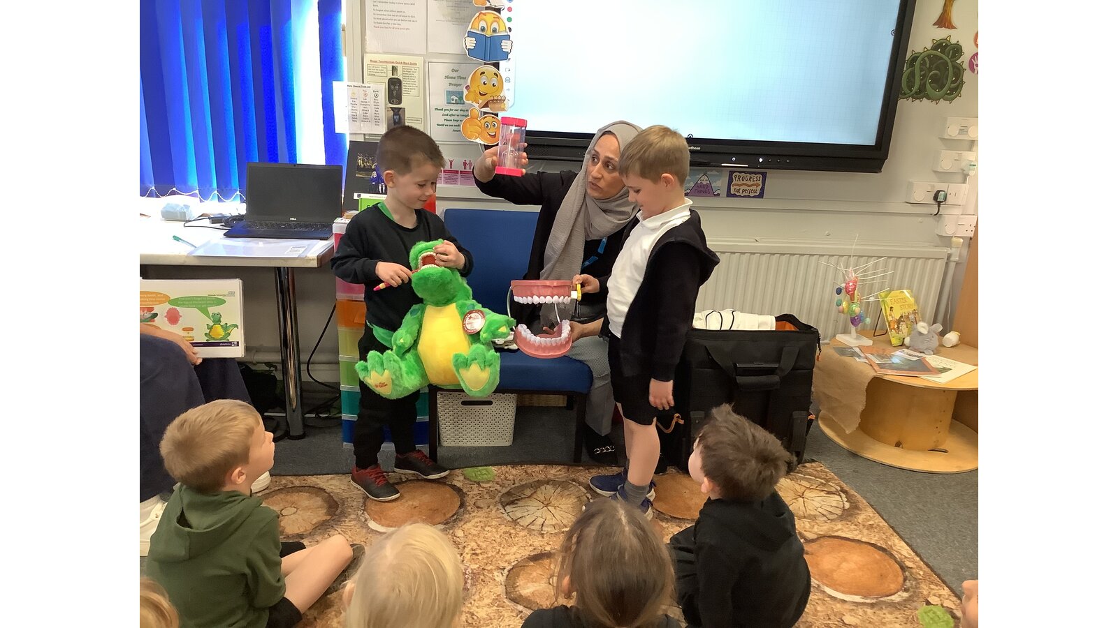 Today we had a visit from the school nurse team and Charlie Crocodile! They talked to us about how to look after our teeth and healthy food choices.