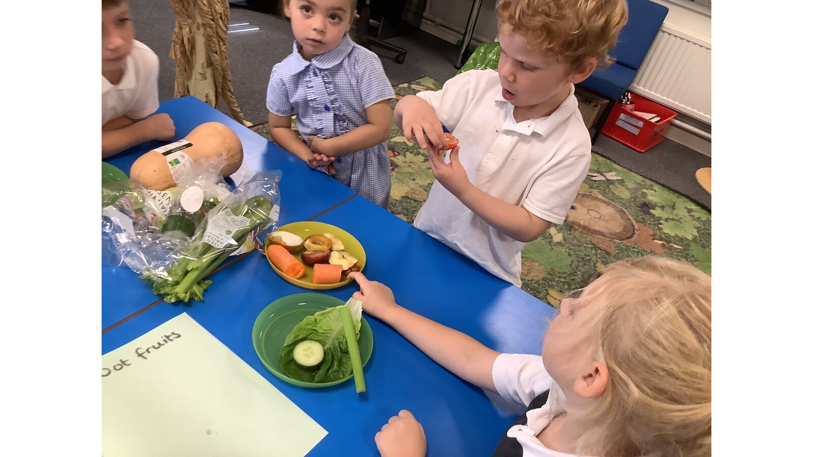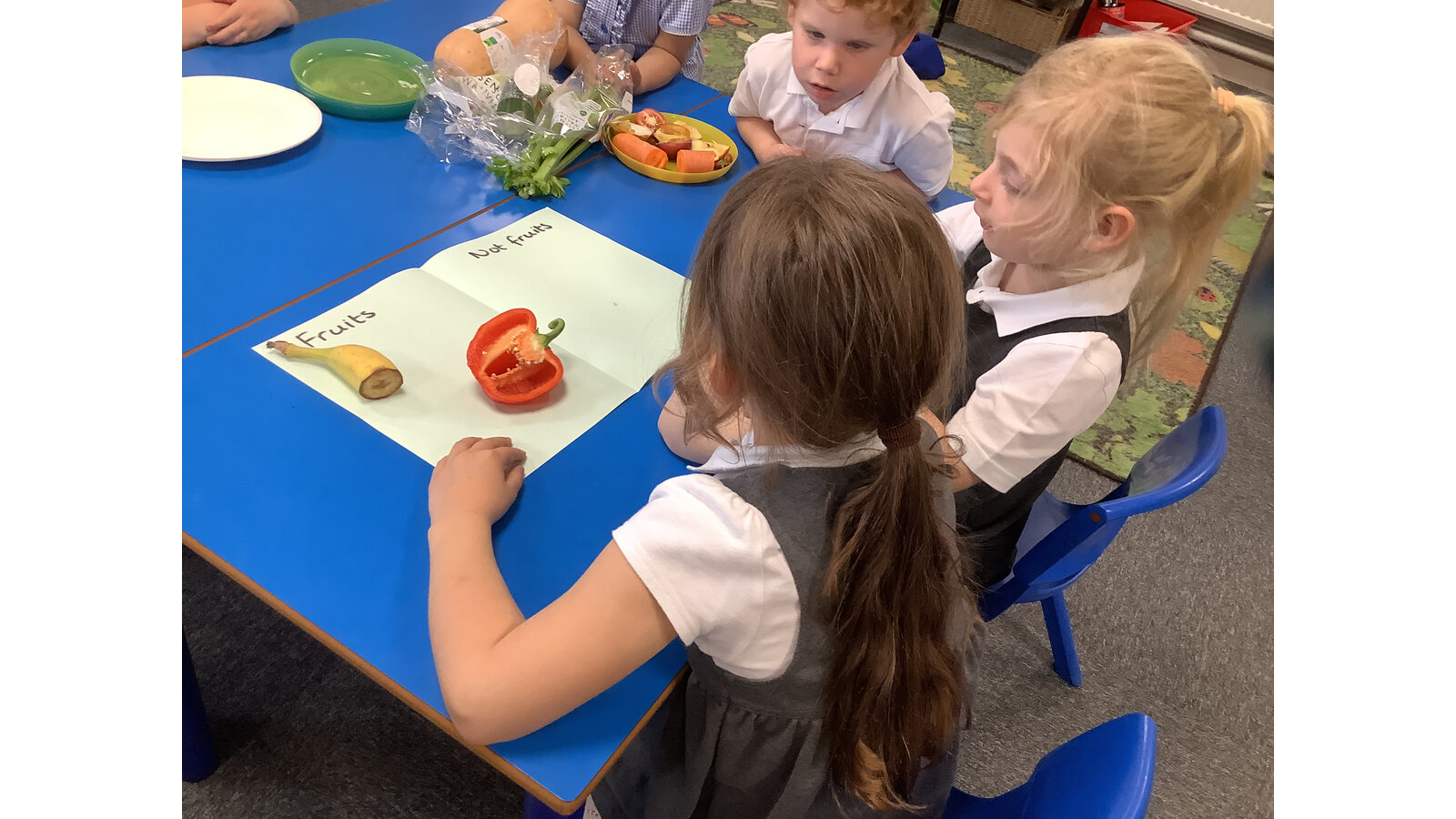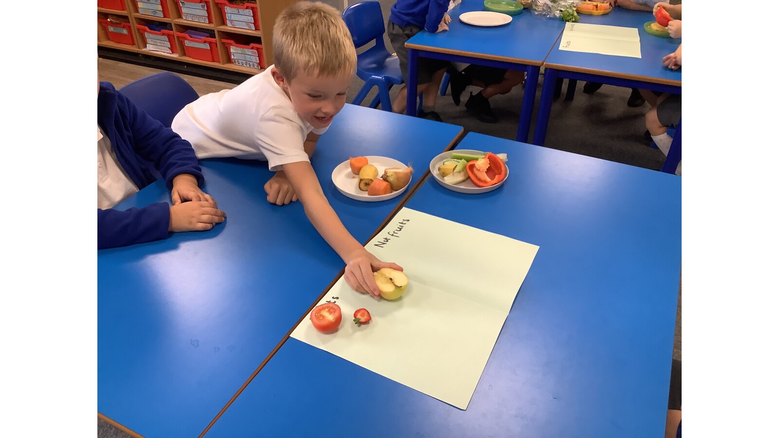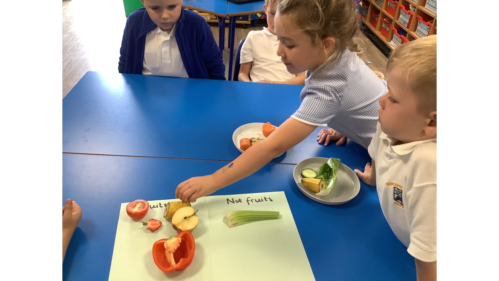 We have been investigating the difference between fruit and vegetables and sorting them.