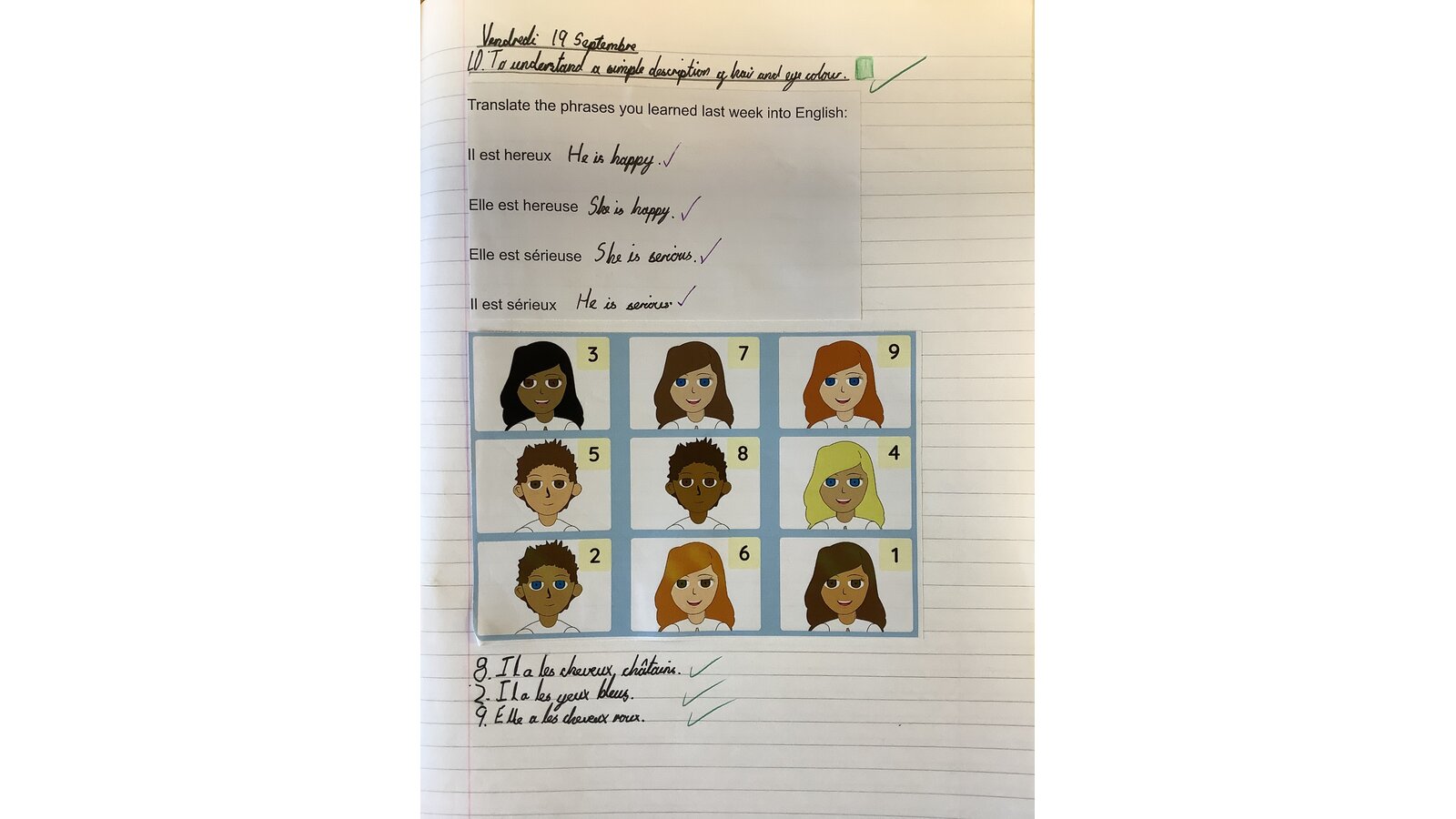 In French this week, Oak Class learned how to say and write simple descriptions of hair and eye colour. The children used their learning from last week about how French adjective endings change depending on whether they are describing masculine or feminine nouns. We also enjoyed playing a French speaking game with our peers!