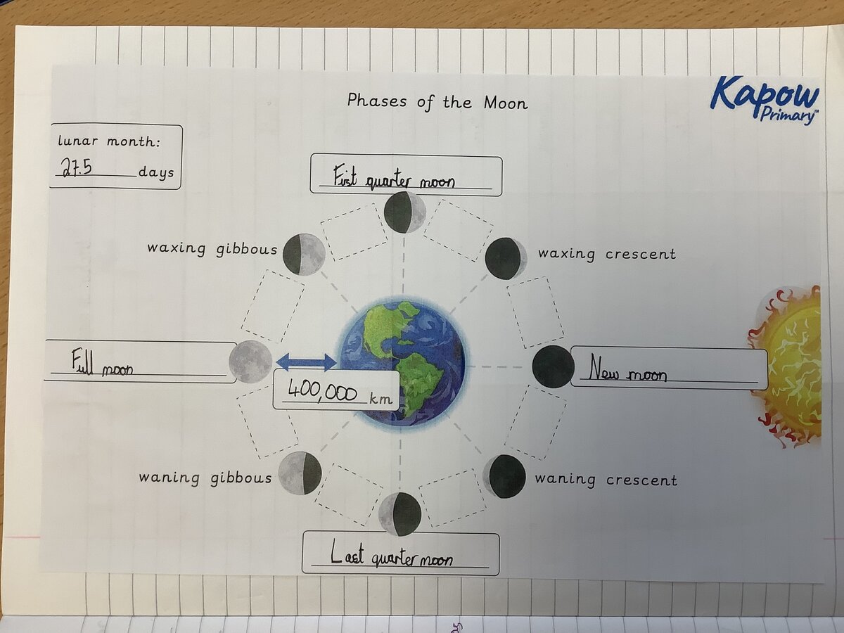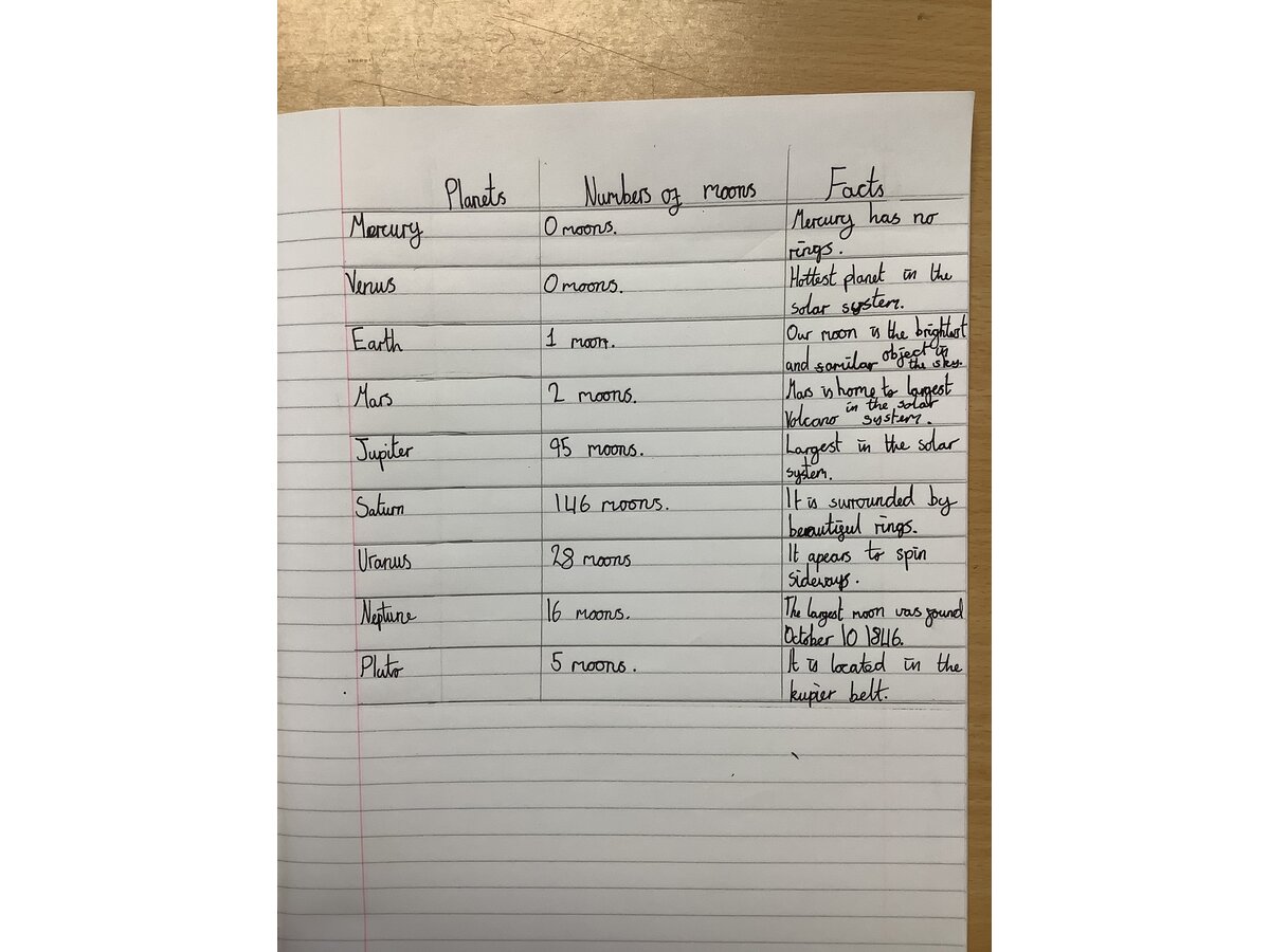 In Science this week, Oak Class learned about the movement of the Moon around Earth. The children defined the term, ‘moon’ and named some of the phases of the Moon, which explain how it looks different at different times of the month. We then researched the moons of other planets and, working scientifically, recorded our findings in a table.