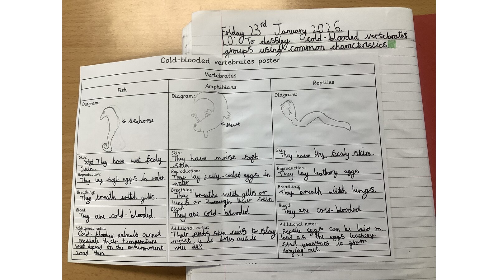 In Science we have identified vertebrates and invertebrates and looked at cold-blooded reptiles, amphibians and fish. We researched each animal group in teams to create information posters and looked at ways of classifying using a branching key.