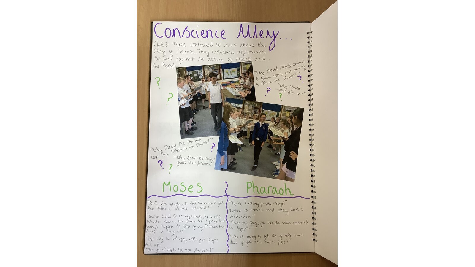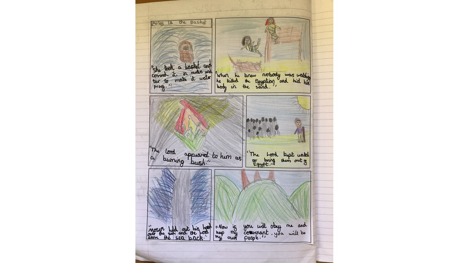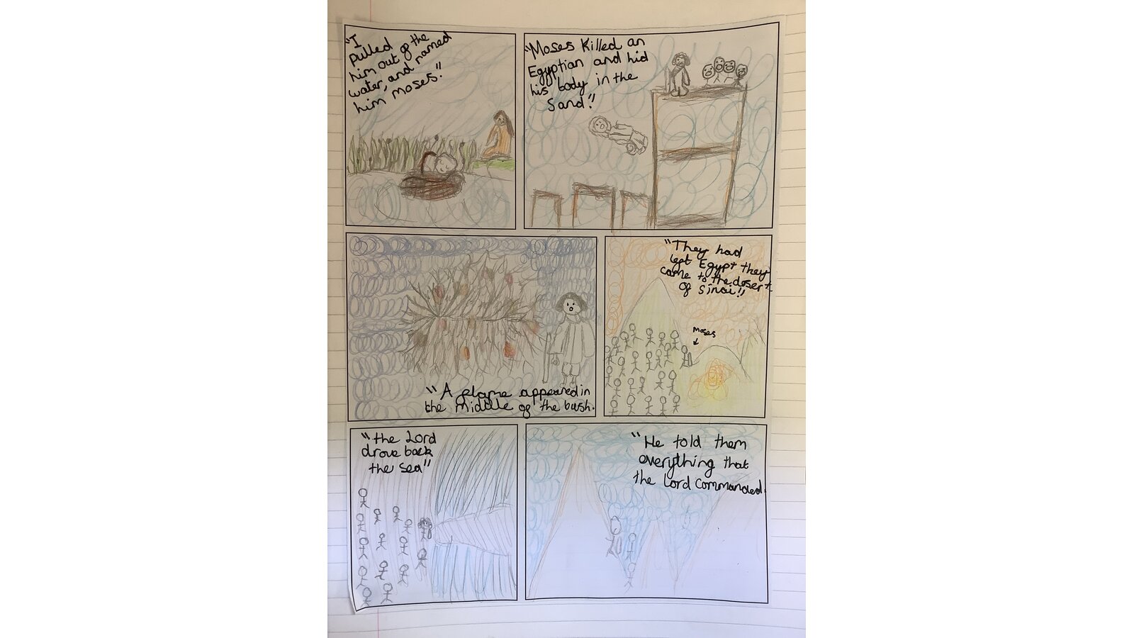 In RE this week, Class Three explored the themes of freedom and salvation in the story of Moses. We began by learning about the rest of the story of Moses before using drama to consider what Moses and the Pharaoh should have done using a conscience alley activity! The children had great and very interesting reasons for why Moses should have listened to God and not given up, why he should have gone against God’s will, why the Pharaoh should have ignored the instruction from Moses and also why he should have listened and freed the Hebrew slaves. The children then found the story of Moses in the Bible and used quotes to create their own comic strip to summarise the key points of the story! We also reflected on what we would have done in this scenario and how our school values could have been shown and used!