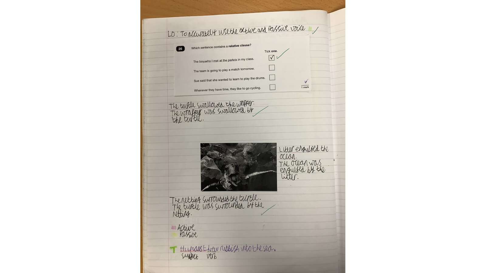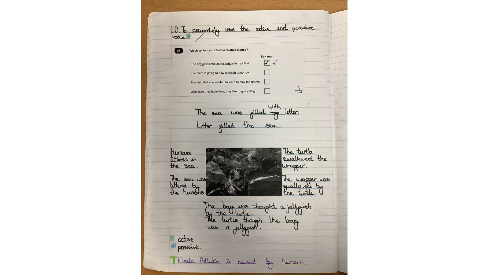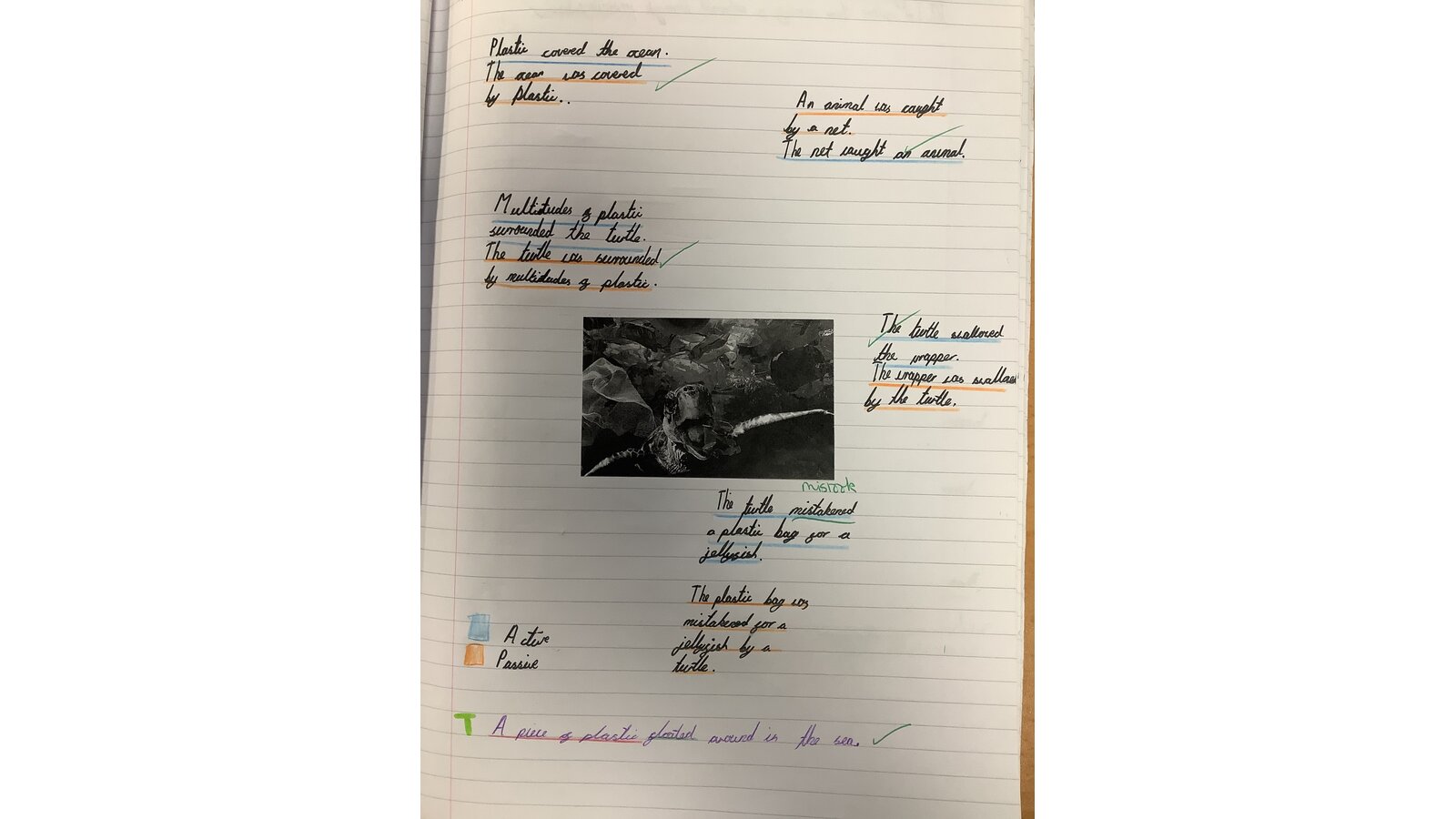 Class Three learned how to accurately use the active and passive voice in preparation for writing their newspaper reports. They explored the position of subjects and verbs within sentences and learned when and why an author may select to use the passive voice. The children wrote their own active and passive sentences about an image associated with our current topic - plastic pollution. Well done Class Three!